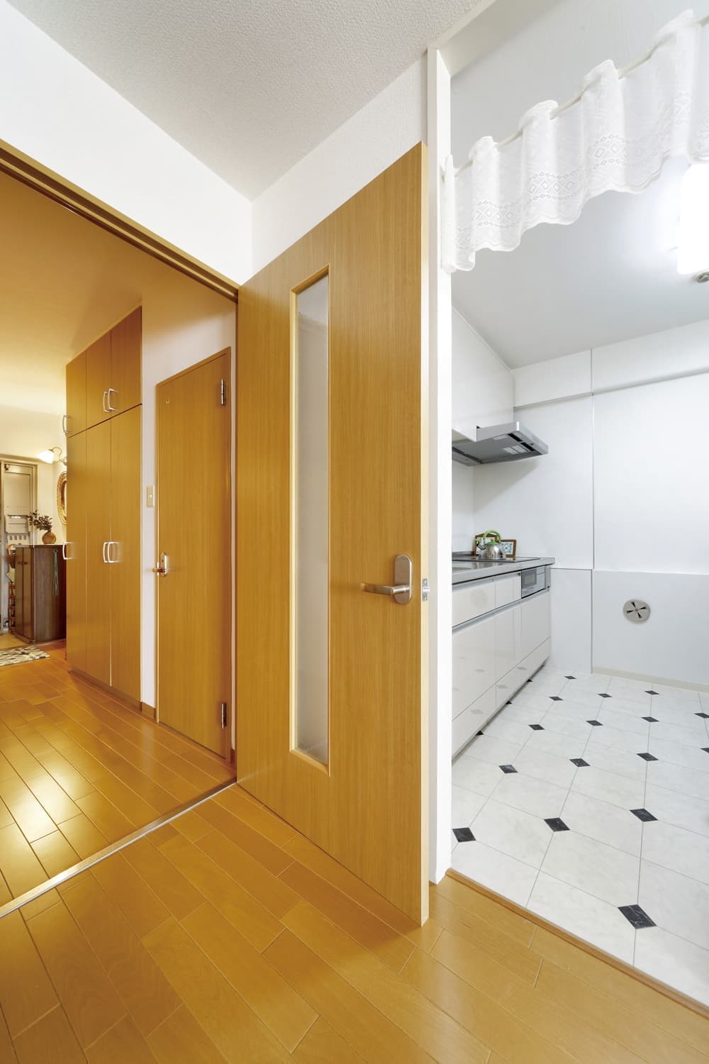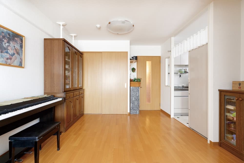 バルコニーに面していた和室を取り壊し、明るく広いリビングに。床は防音効果に優れたフローリング材に張替えました。コストに配慮して35年前の建具枠をそのまま活かすため、建具類を自社職人で造作しました。